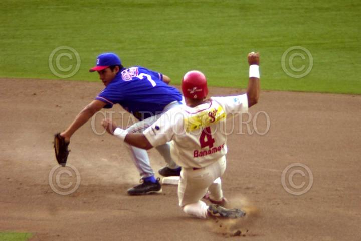 Gonzálo Meza de los Diablos de México roba segunda base, pero los Olmecas de Tabasco logran obtener un Doble play para cerrar la septima entrada, en el Foro Sol. FOTO: David Bolaños/CUARTOSCURO.COM