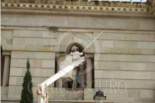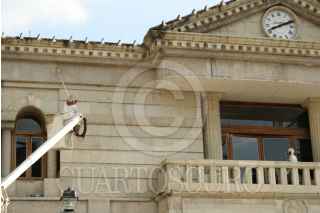 CHILPANCINGO, GUERRERO 11ENERO2009.- Trabajos de exterminio que llevaron a cabo personal de Servicios Publicos Municipales contra el enjambre de abejas africanas que aun continuaban en la fachada del Palacio Municipal este domingo, esto con la finalidad de evitar algun nuevo ataque contra personas que pasan diariamente por el zocalo de la capital del estado como el ocurrido la semana pasada. FOTO: OSCAR ALVARADO/CUARTOSCURO.COM