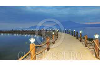 JOCOTEPEC, JALISCO, 12ENERO2009.- En ocasión de la fiesta del Santo patrono que celebra el Señor del Monte, la ciudad de Jocotepec luce esplendorosa estrenando luces nocturna en el recientemente construido malecón y barco para turistas en el lago Chapala. Todo contribuye a crear una atmosfera de ensueño. FOTO:MARIA DI PAOLA BLUM/CUARTOSCURO.COM