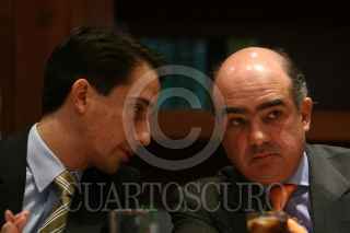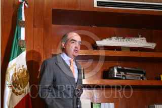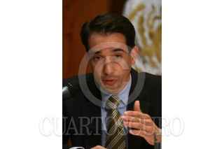 MÉXICO, D.F., 13ENERO2009.- Alejandro Chacon Director General de Aeropuertos y Marina conversa con el Titular de la Secretaria de Comunicaciones y Trasportes Luis Tellez durante la conferencia de prensa que ofreció en las instalaciones de la secretaria donde habló en materia de infraestructura portuaria. FOTO: SÁSHENKA GUTIERREZ/CUARTOSCURO.COM