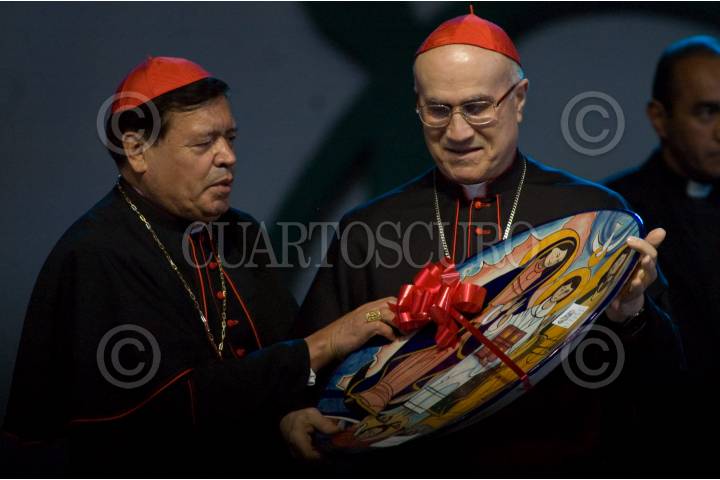 MÉXICO D.F., 16ENERO2009.- El presidente del Encuentro Mundial de las Familias, cardenal Ennio Antonelli; el secretario de Estado Vaticano, cardenal Tarcisio Bertone y el arzobispo primado de México Norberto Rivera Carrera durante la sesión conclusiva del VI Encuentro Mundial de las Familias 2009 que se celebro en el Centro de Exposiciones Bancomer. FOTO: RODOLFO ANGULO/CUARTOSCURO.COM