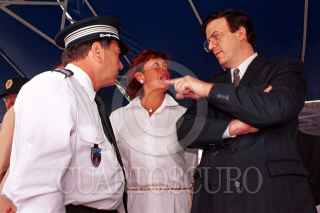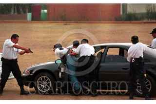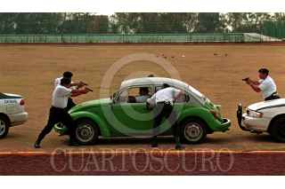 Michele Creyssac, comandante de la policia francesa y Marcelo Ebrard, secretario de Seguridad Pública durante el evento de clausura y exhibición del curso Brigadas Anticrimen -impartido por la policía francesa. FOTO: Susana Navarrete/CUARTOSCURO.COM