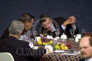 El presidente Vicente Fox, dialoga con Javier Usabiaga, secretario de la Sagarpa durante la comida que ofreció por la Clausura de los Trabajos de la XIX Asamblea General Ordinaria del Consejo Nacional Agropecuario. FOTO: Oswaldo Ramírez/CUARTOSCURO.COM