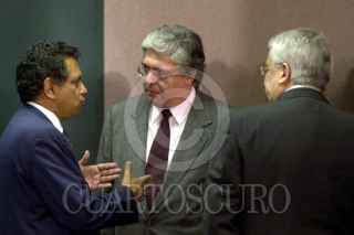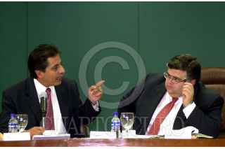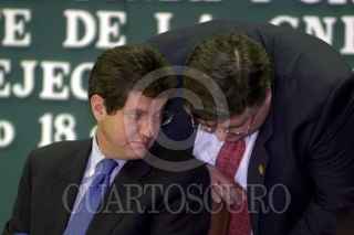 Jonathan Davis, presidente de la Comisión Nacional Bancaria y de Valores dialoga con Agustin Cartens durante la comparecencia ante el Comisión Permanente del Congreso. FOTO: Oswaldo Ramírez/CUARTOSCURO.COM