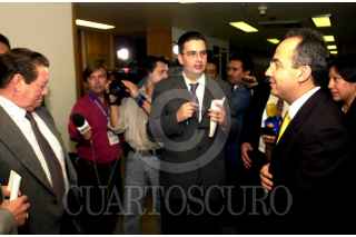 Rafael Rodriguez Barrera y Felipe Calderón Hinojosa, coodinadores parlamentarios en San Lázaro del PRI y PAN respectivamente, momentos antes del inicio de la Junta de Coordinación Política. FOTO: Pedro Mera/CUARTOSCURO.COM