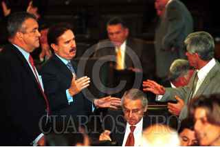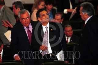 Los senadores del PRI y PAN, Emilio Gamboa Patrón y Fauzi Hamdam, conversan durante la sesión de la cámara alta. FOTO: Juan Pablo Zamora/CUARTOSCURO.COM