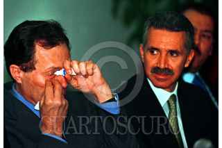 Rodolfo Echeverría aplica unas gotas para los ojos, mientras Roberto Madrazo y Manlio Fabio Beltrones le observan, durante la reunión que el Partido tricolor sostuvo para instalar la Convencion Nacional Hacendaria. FOTO: Juan Pablo Zamora/CUARTOSCURO.COM