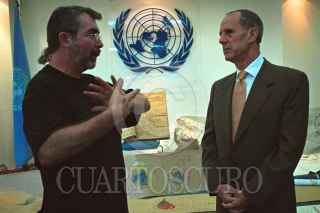 H. Pascal, representante del Museo Universitario del Chopo, entrega al director de la ONU, Angel Escudero de Paz, las mil firmas que juntaron intelectuales y la sociedad en general, en contra de la guerra de de Estados Unidos e Irak. FOTO: Eunice Adorno/CUARTOSCURO.COM