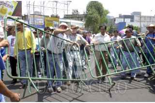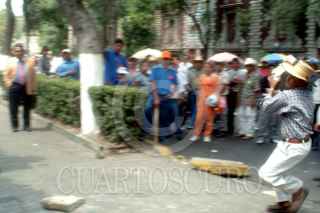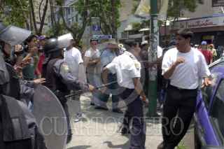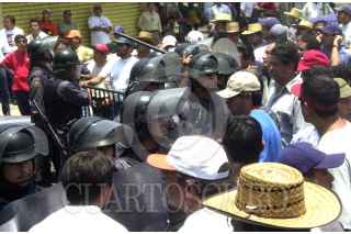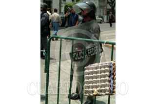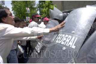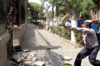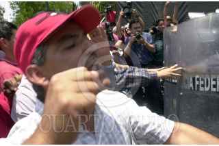 Maestros integrantes de la CNTE, lanzan piedras a una de las puertas de gobernación, mietras esparaban ser atendidos por Sangiago Creel, secretario de Gobernación. FOTO: Nelly Salas/CUARTOSCURO.COM