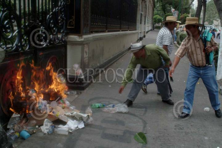 Maestros integrantes de la CNTE, lanzan piedras a una de las puertas de gobernación, mietras esparaban ser atendidos por Sangiago Creel, secretario de Gobernación. FOTO: Nelly Salas/CUARTOSCURO.COM