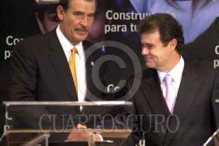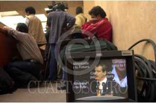 Un auxiliar de camarógrafo duerme una siesta mientras Vicente Fox da su discurso luego de firmar un convenio de entre la SCT y NAFIN, esta mañana en Los pinos. FOTO:Juan Pablo Zamora/CUARTOSCURO.COM