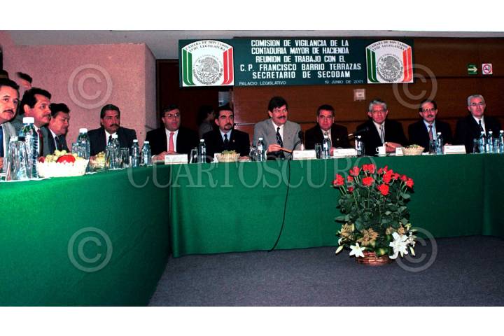 Francisco Barrio, secretario de la Contraloria, fue recibido por el diputado del PAN Manuel Galan (der.), presidente de la Comisión de Vigilancia de la Contaduria Mayor de Hacienda durante una reunión de trabajo. FOTO:Oswaldo Ramírez/CUARTOSCURO.COM