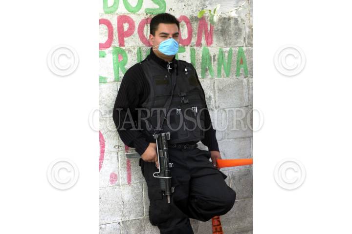 Un elemento de la policia Estatal descansa con su arma luego del operativo que esta corporación realizó para acordonar la zona industrial de Ciudad Neza, en donde se incendió una fabrica de pinturas. El saldo fue de dos personas intoxicadas y la completa pérdida del inmueble. FOTO: Juan Pablo Zamora/CUARTOSCURO.COM