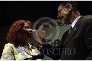 Carlos Abascal, secretario del Trabajo, platica con Mayela Trueba durante la inaguración del Primer Foro de la Mujer en la CROM. Ahi Abascal declaró que no debe haber una guerra de sexos en la disputa por la presidencia de 2006. FOTO: Juan Pablo Zamora/CUARTOSCURO.COM