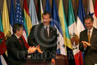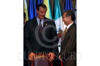 Vicente Fox y , Luis Ernesto Derbéz, secretario de Relaciones Exteriores luego de la clausura de la "Conferencia Especial sobre seguridad" organizada por Organización de Estados Americanos. FOTO: Juan Pablo Zamora/CUARTOSCURO.COM