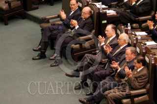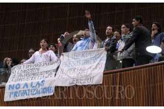 Un grupo de estudiantes colocaron unas mantas en las que manifestaron su rechazo a las privatizaciones y pidieron la libertad de los hermanos Cezero durante la ceremonia en el recinto de San Lázaro, donde se colocaron en el muro de honor en letras de oro Universidad Nacional Autónoma de México. FOTO: Nelly Salas/CUARTOSCURO.COM