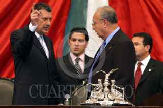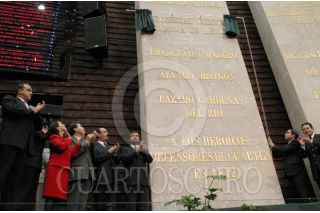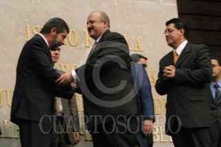 El rector de la UNAM, Juan Ramón de la Fuuente se despide de Reyes Tamez, secretario de Educación Pública, al termino de la ceremonia donde se colocaron en letras de oro Universidad Nacional Autónoma de México, en el muro de honor del recinto de San Lázaro. FOTO: Nelly Salas/CUARTOSCURO.COM