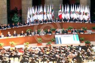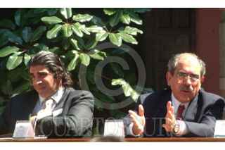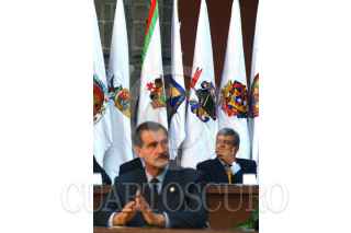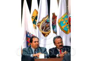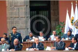 René Juárez gobernador del estado de Guerrero y Lázaro Cardenas Batel, gobernador de Michoacán, durante la ceremonia de la firman la convocatoria de la primera Convención Nacional Hacendaria. FOTO: Eunice Adorno/CUARTOSCURO.COM
