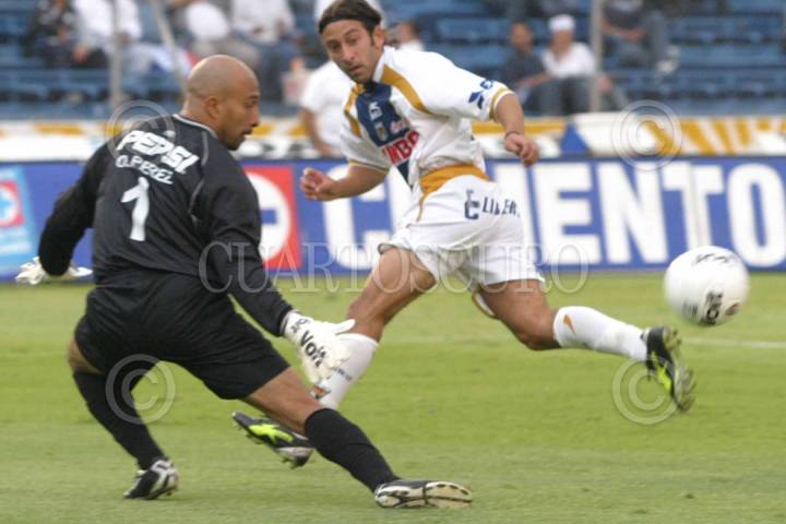 México, D.F. 07 Febrero 2004.- San Luis venció 4 goles por uno a Cruz Azul en el partido de la jornada 4 del torneo de clausura 2004 disputado en el estadio Azul. En la gráfica Sergio Blanco (San Luis) disputa un balón con Melvin Brown (Cruz Azul). FOTO: Iván Stephens/CUARTOSCURO.COM