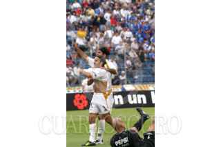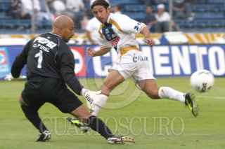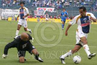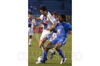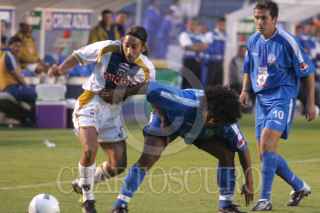 México, D.F. 07 Febrero 2004.- San Luis venció 4 goles por uno a Cruz Azul en el partido de la jornada 4 del torneo de clausura 2004 disputado en el estadio Azul. En la gráfica Sergio Blanco (San Luis) disputa un balón con Melvin Brown (Cruz Azul). FOTO: Iván Stephens/CUARTOSCURO.COM