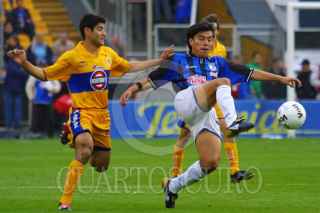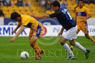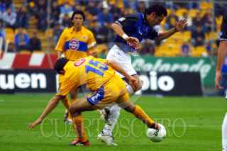 Monterrey, N. L. Mexico 07Febrero2004.- El jugador de Tigres Mario Ruiz y el Jugador de Queretaro Jorge Cervera, disputan un balon durante el juego de la Jornada 4 del Torneo Clausura 2004. FOTO: JORGE LOPEZ/CUARTOSCURO.COM