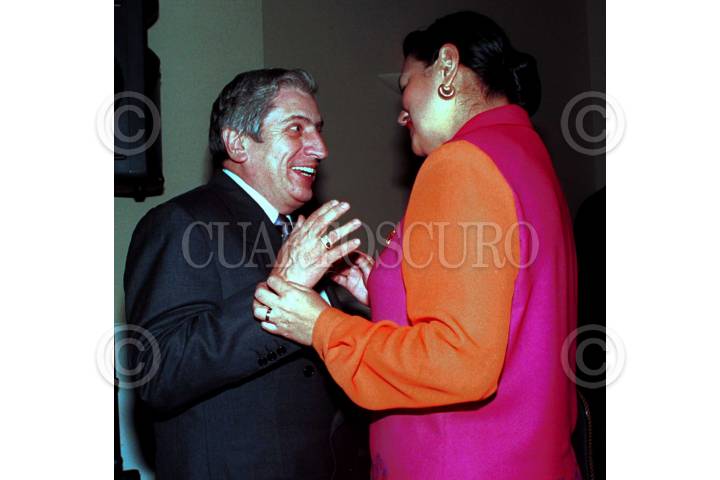 El tabasqueño Arturo Nuñez se dio tiempo para asistir al aniversario de "La Entrevista", es recibido por la lider del PRI Dulce Maria Sauri. FOTO:Oswaldo Ramírez/CUARTOSCURO.COM