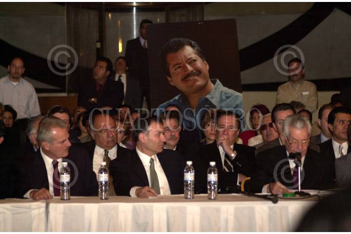 México, D.F. 10 FEBRERO 2004.- Francisco Labastida (PRI), Alfonso Durazo, secretario particular del presidente Fox, y Luis Colosio, durante el 54 aniversario del nacimiento del condidato presidencial priísta. FOTO: Sandra Perdomo/CUARTOSCURO.COM