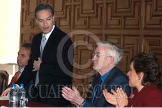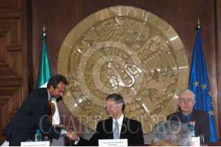 México D.F, 10FEB2004.- Germano Stranieros representante de la Unión Europea , Luis Ernesto Derbez, secretario de Relaciones Exteriores y Art Id Agnew embajador de Irlanda durante la firma de un acuerdo de Derechos Humnos. FOTO: Germán Romero/CUARTOSCURO.COM