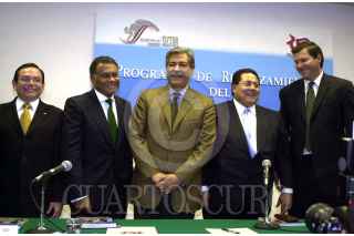 México, D.F. FEBRERO 2004.- Los gobernadores Jorge Hurtado Valdéz (Campeche), Joaquin Henricks Díaz (Quintana Roo), el secretario de Turismo, Rodolfo Elizondo, Manuel Andrade Díaz (Tabasco) y Patricio Patron Laviada ( Yucatán) anunciaron el programa de relanzamiento del Mundo Maya. FOTO: Sandra Perdomo/CUARTOSCURO.COM