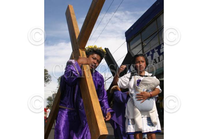 México, D. F. 09 Abril 2004.- Nazarenos que realizan penitencia y llevan a cuesta cruces y coronas de espinas en su frente por las calles de Iztapalapa hasta la iglesia de la cuevita. FOTO: Nelly Salas/CUARTOSCURO.COM