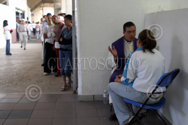 México, D.F., 10ABRIL2004.- Una joven es confesado por un padre en los pasillos del Estadio Azteca, durante la reunión de miles de jóvenes cristianos para conmemorar la resurreción de Jesucristo. FOTO: Moisés Pablo/CUARTOSCURO.COM