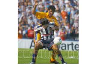 Monterrey, N.L. 10 de Abril de 2004.- Walter Erviti, jugador de Monterrey y Mario Ruiz jugador de Tigres, disputan el balón, durante el clásico regiomontano, realizado en el estadio Tecnológico de esta ciudad. FOTO: Jorge López/CUARTOSCURO.COM