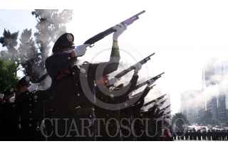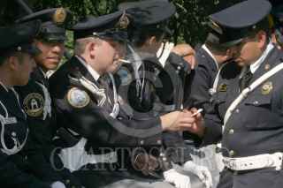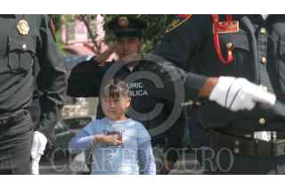 México, D.F., 13ABRIL2004.- Una niña rinde honores a la bandera durante la ceremonia de entrega de constancias de ascensos a policias de la bancaria en el monumento a la Revolución. FOTO: Moisés Pablo/CUARTOSCURO.COM