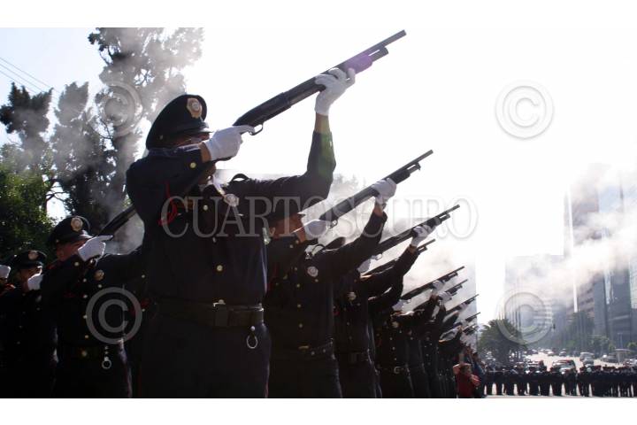 México, D.F., 13ABRIL2004.- Una niña rinde honores a la bandera durante la ceremonia de entrega de constancias de ascensos a policias de la bancaria en el monumento a la Revolución. FOTO: Moisés Pablo/CUARTOSCURO.COM