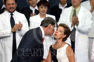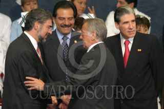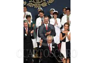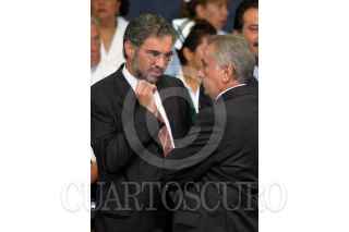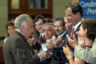 México, D.F.,14ABRIL2004.- Santiago Levy, director del IMSS y Joel Ayala, sindicato de trabajadores al servicio del estado, durante la entrega de Condecaraciones y Premios del Consejo de Salubridad General. FOTO: Moisés Pablo/CUARTOSCURO.COM
