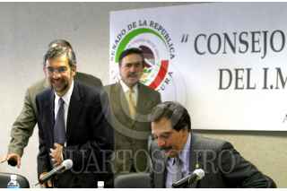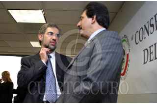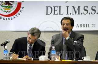 México, D.F. 21 ABRIL 2004.- Santiago Levy, director del IMSS, y Elias Miguel Moreno Brisuela, presidente de la Comisión de Salud, mientras esperan la presencia de diputados y senadores que asistieron a la comparecencia. FOTO: Sandra Perdomo/CUARTOSCURO.COM