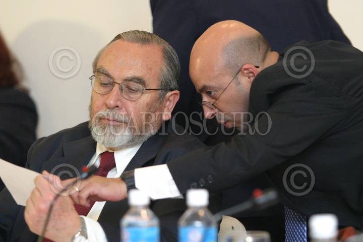 México, D.F. 22 ABRIL 2004.- Bernardo Bátiz, procurador de justicia del DF, dialoga con Renato Sales, subprocurador de investigaciones previas durante su comparecencia ante la comisión del Distrito Federal. FOTO: Sandra Perdomo/CUARTOSCURO.COM