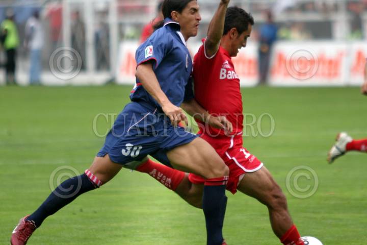 Toluca, Edomex, 02JUNIO2004.- Israel López del Toluca le enseña los tacos a Ramón Morales de las Chivas, en el partido de semifinales que disputaron en la Bombonera. Los Diablos se alzaron con la victoria de 1-0. FOTO: Moisés Pablo/CUARTOSCURO.COM