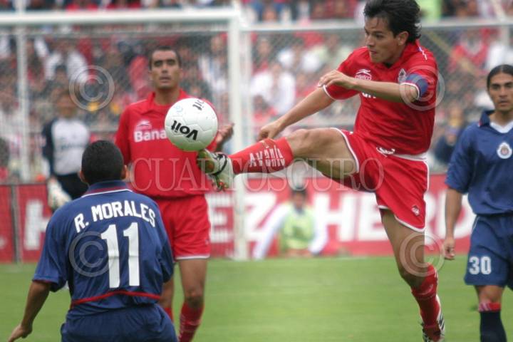 Toluca, Edomex, 02JUNIO2004.- Israel López del Toluca le enseña los tacos a Ramón Morales de las Chivas, en el partido de semifinales que disputaron en la Bombonera. Los Diablos se alzaron con la victoria de 1-0. FOTO: Moisés Pablo/CUARTOSCURO.COM