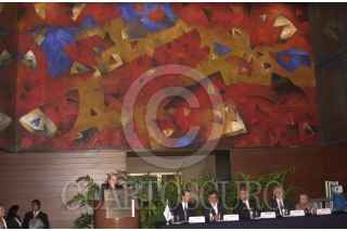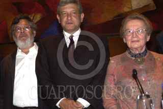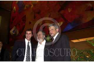 México, D. F. 03 Junio 2004.- Siahou Sittn, propietario del hotel Sheraton del Centro Histórico, el muralista José Villalobos y el jefe de gobierno Andrés Manuel López Obrador durante la inauguración del mural "El lugar de Rojo Tezontle" . FOTO: Eunice Adorno/CUARTOSCURO.COM