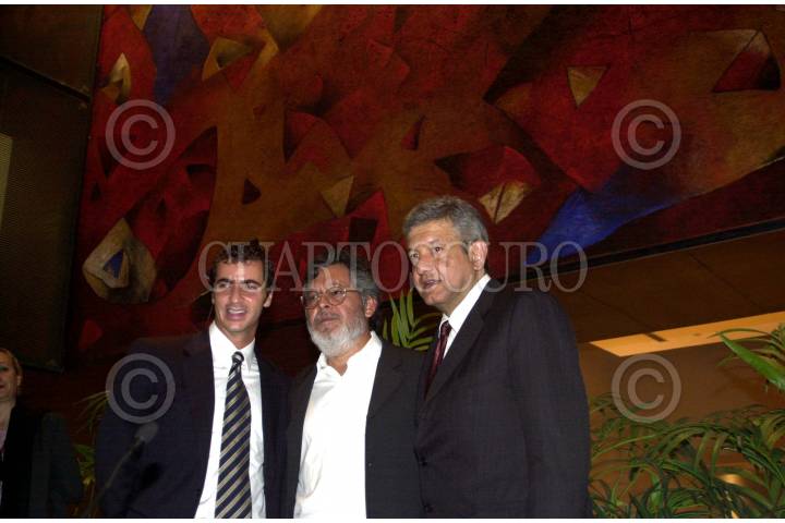 México, D. F. 03 Junio 2004.- Siahou Sittn, propietario del hotel Sheraton del Centro Histórico, el muralista José Villalobos y el jefe de gobierno Andrés Manuel López Obrador durante la inauguración del mural "El lugar de Rojo Tezontle" . FOTO: Eunice Adorno/CUARTOSCURO.COM