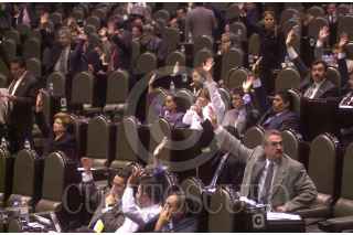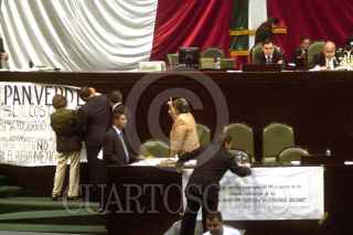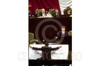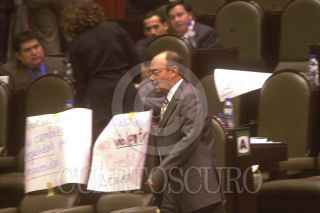MEXDF30JULIO2004.- Juan de Dios Castro, presidente de la Mesa directiva, durante la sesión extraordinaria de la Cámara de Diputados en donde se aprobó en lo general las reformas a la Ley del Seguro Social, con lo cual los nuevos afiliados al IMSS tendrán que costear su pensión y cobrarla en 30 años. FOTO: Eunice Adorno/CUARTOSCURO.COM