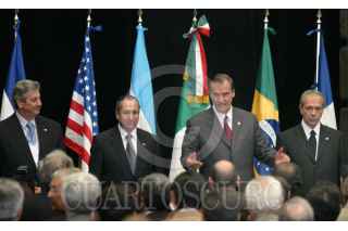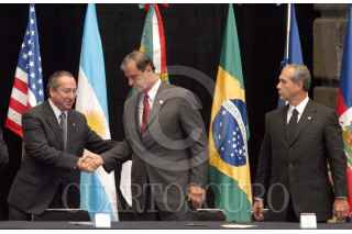 MEXICO D.F. 22SEPTIEMBRE2004.- Vicente Fox Quesada, presidente de la República, Raúl González Apaolaza, presidente de la Unión Mexicana de Ingenieros (izq) y Pedro Cerisola (der), secretario comunicaciones y transportes, durante la inauguración de la XXIX Convención Panamericana de Ingeniería , UPADI 2004, en el Palacio de Minería. FOTO: Moisés Pablo/CUARTOSCURO.COM
