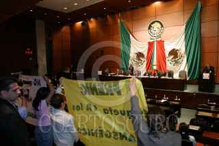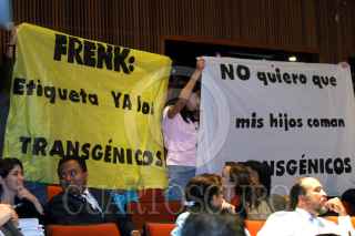 MEXICO D.F. 23SEPTIEMBRE2004.- Integrantes de Green peace se manifestron en contra de los productos transgénicos durante la comparecencia del secretario de salud, Julio Frenk, ante diputados, en el salón verde de san Lázaro. FOTO: Sandra Perdomo/CUARTOSCURO.COM