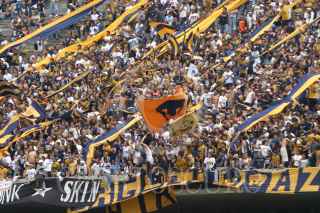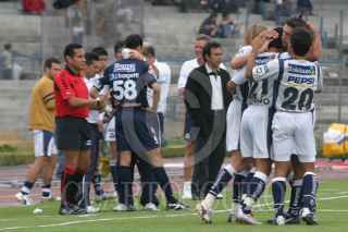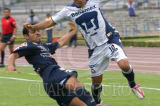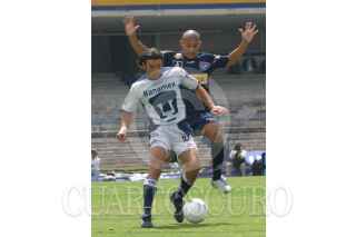 MEXICO, D. F. 03OCTUBRE2004.- Francisco Fonseca de los pumas de la Universidad domina la jugada ante un jugador de Dorados de Sinaloa, en partido disputado en ciudad Univesitaria. FOTO: Nelly Salas/CUARTOSCURO.COM