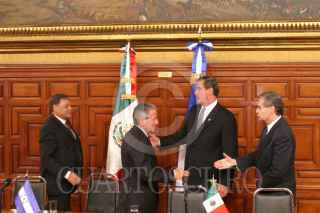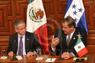 MEXICO, D.F. 10 NOVIEMBRE 2004.- El presidente Vicente Fox levanta una bandera que se les cayó a los niños presentes en la ceremonia de bienvenida del mandatario hondureño, Ricardo Maduro, realizada en Palacio Nacional. FOTO: Sandra Perdomo/CUARTOSCURO.COM