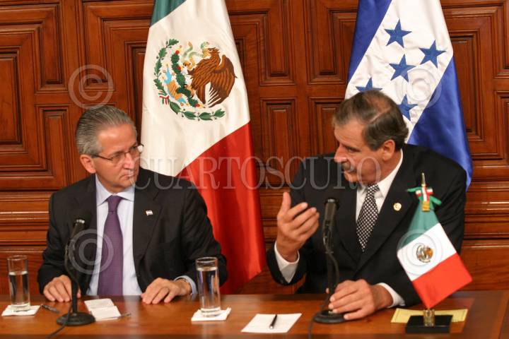 MEXICO, D.F. 10 NOVIEMBRE 2004.- El presidente Vicente Fox levanta una bandera que se les cayó a los niños presentes en la ceremonia de bienvenida del mandatario hondureño, Ricardo Maduro, realizada en Palacio Nacional. FOTO: Sandra Perdomo/CUARTOSCURO.COM