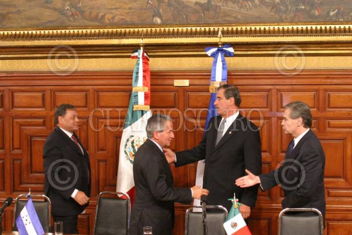 MEXICO, D.F. 10 NOVIEMBRE 2004.- El presidente Vicente Fox levanta una bandera que se les cayó a los niños presentes en la ceremonia de bienvenida del mandatario hondureño, Ricardo Maduro, realizada en Palacio Nacional. FOTO: Sandra Perdomo/CUARTOSCURO.COM