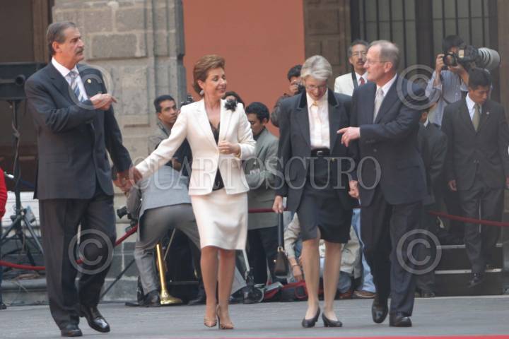 MEXICO D.F 11 NOVIEMBRE 2004.- El presidente Vicente Fox junto con su esposa Marta Sahagún y Joseph Deiss presidente de la confederación Suiza junto con su esposa Elisabeth Deiss-Muller platican en el patio de Palacio Nacional al término de la ceremonia de bienvenida con motivo de su visita. FOTO: Eunice Adorno/CUARTOSCURO.COM