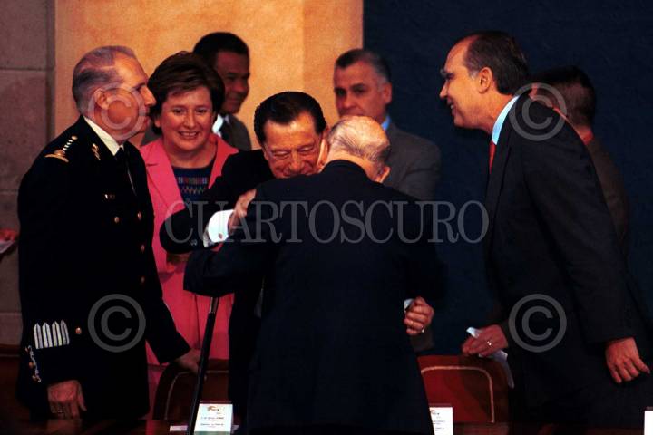 Vicente Fox y Rafael Macedo de la Concha conversan después de terminado el evento para prevenir adicciones. FOTO: Christian Palma/CUARTOSCURO.COM